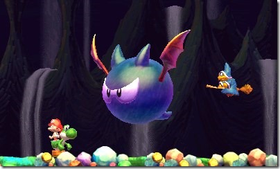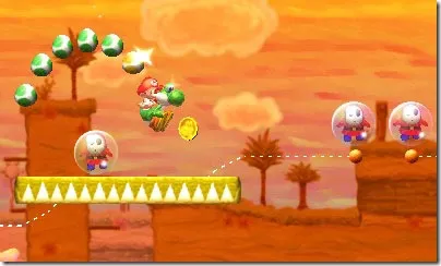 What you’ve heard of the music may have fooled you, too. While the title theme is a kazoo-crazy arrangement you’d expect to hear at, say, the opening ceremony of a clown academy, the game actually features a pleasant musical palette. My favorite song, the overworld theme, is actually made up of six complimentary parts; as you make your way through each world, an instrument is added to the mix until it crescendos into a theme truly worthy of the “Yoshi” name. Check it out below. ) As you’ll be aiming to collect 30 stars, 20 red coins, and 5 smiley flowers in each of the six worlds’ eight stages, there will be plenty of time for you to enjoy the audio-visual elements of Yoshi’s New Island. It’d be foolish to play into its childish façade, though, as the game will openly challenge the depth of your platforming ability. Don’t Fear the Spear will have you questioning your choice of hobby—and in that sense displays a degree of “the Tezuka Touch.” The new experiences of Yoshi’s New Island, like firing Mega Dozer Eggs (which decimate swaths of stone) and transformation bonus areas (they are separate areas here), are spread out more or less equally, and they’re always fun. Sure, the gyroscope control can be irritating, but I appreciated the break from platforming. Yoshi Stars will have you running up, down, and all around walls, too, as if you were Sonic the Hedgehog himself. I guess Arzest, made up of former Sega employees, couldn’t resist including a subtle nudge to their legacy.