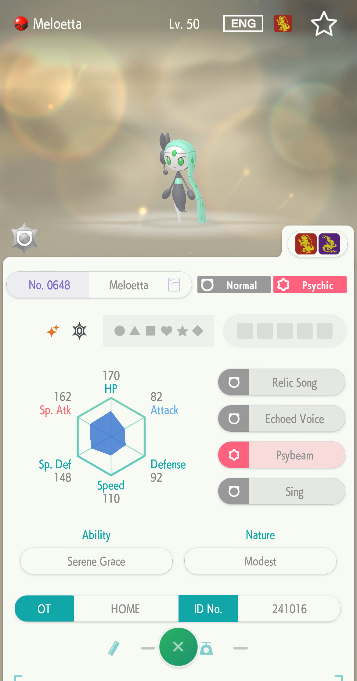 There’s also a screenshot showing the Shiny Meloetta in the Pokemon Home app. The Normal and Psychic type will be at level 50 when it arrives. The one shown in the screenshot has 170 HP, 82 attack, 162 special attack, 92 defense, 148 special defense, and 110 speed. The Modest nature boosts special attack at the cost of attack. Serene Grace also makes it more likely Meloetta’s attack effects will trigger. The character arrives knowing Echoed Voice, Psybeam, Relic Song, and Sing. So Serene Grace would affect Psybeam and Relic Song.