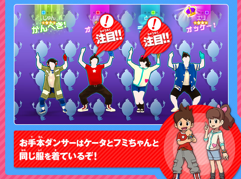 In addition to having Yokai dance alongside your character in the game, the dancers will also sport clothes of the characters from the games. Yo-kai Watch Dance: Just Dance Special Version is in development for Wii U.