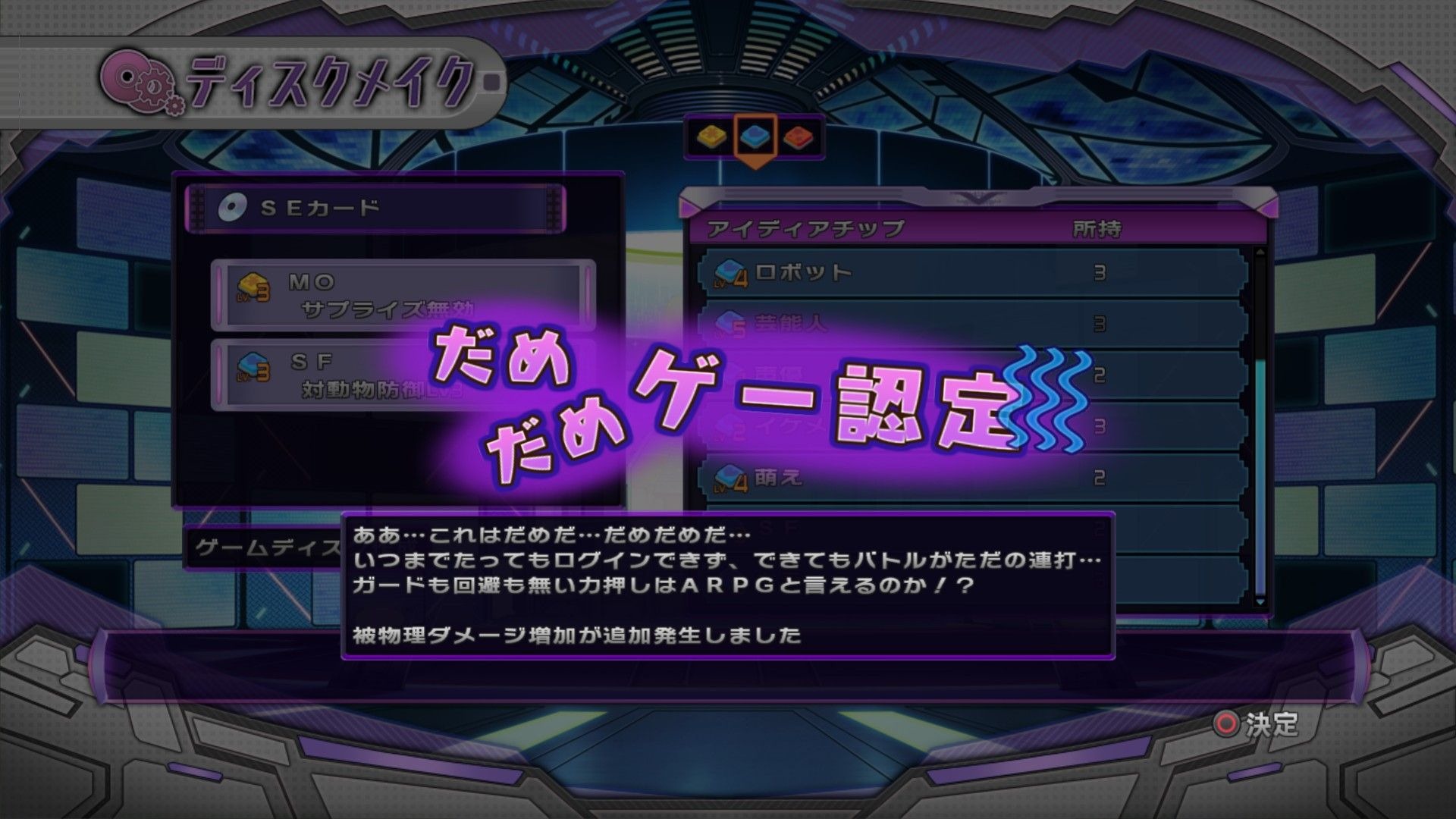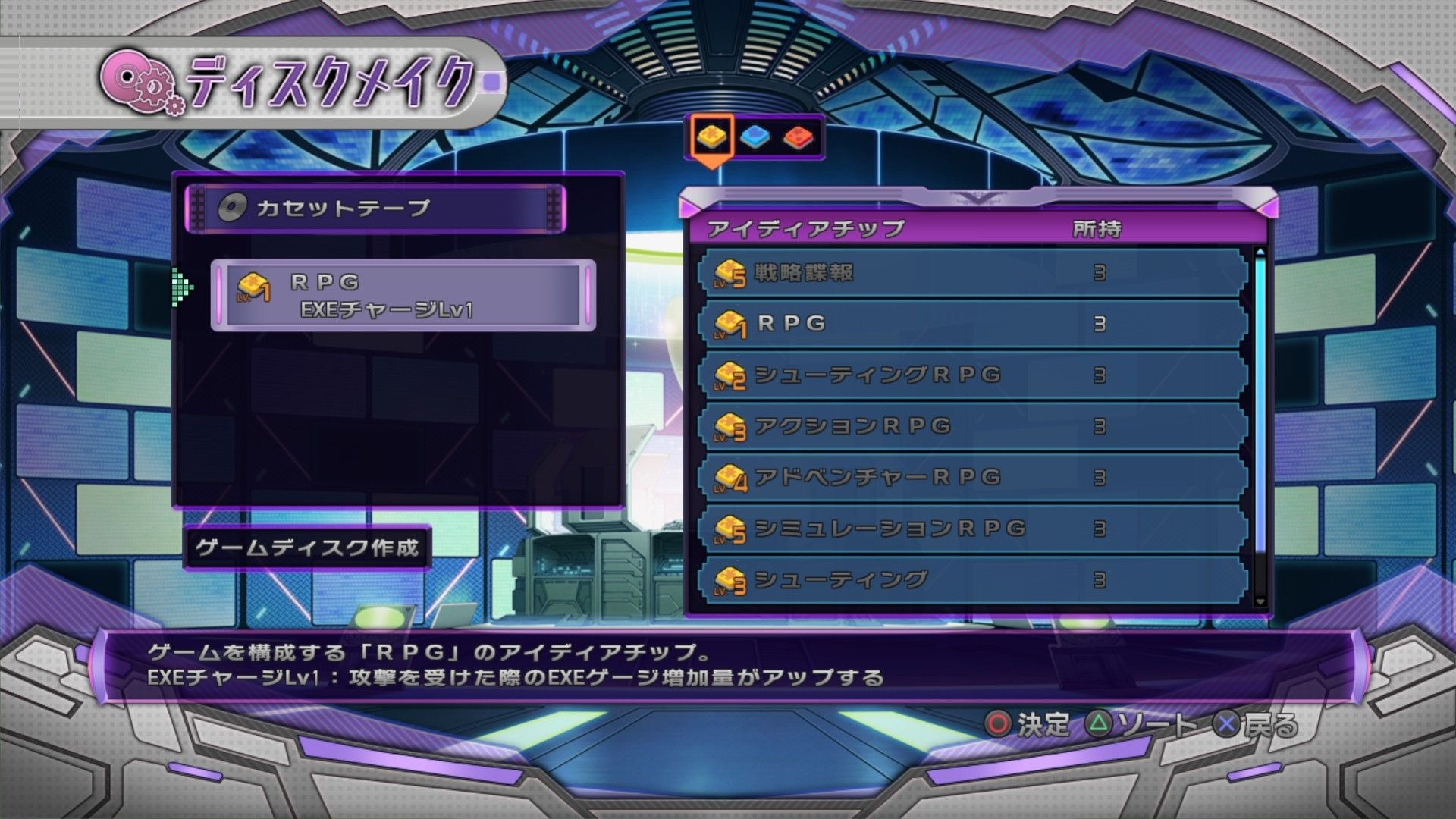 Neptunia V has a new character customization feature called the Blank Disc System. Players combine idea chips and try to burn a "god game." If you end up with a bad combination like "hover vehicle" and "historical thing" you’ll end up with a useless game. On the other hand, mixing an "action game" and a "mustached Italian man" and you’ll have a god game that decreases damage in battle.