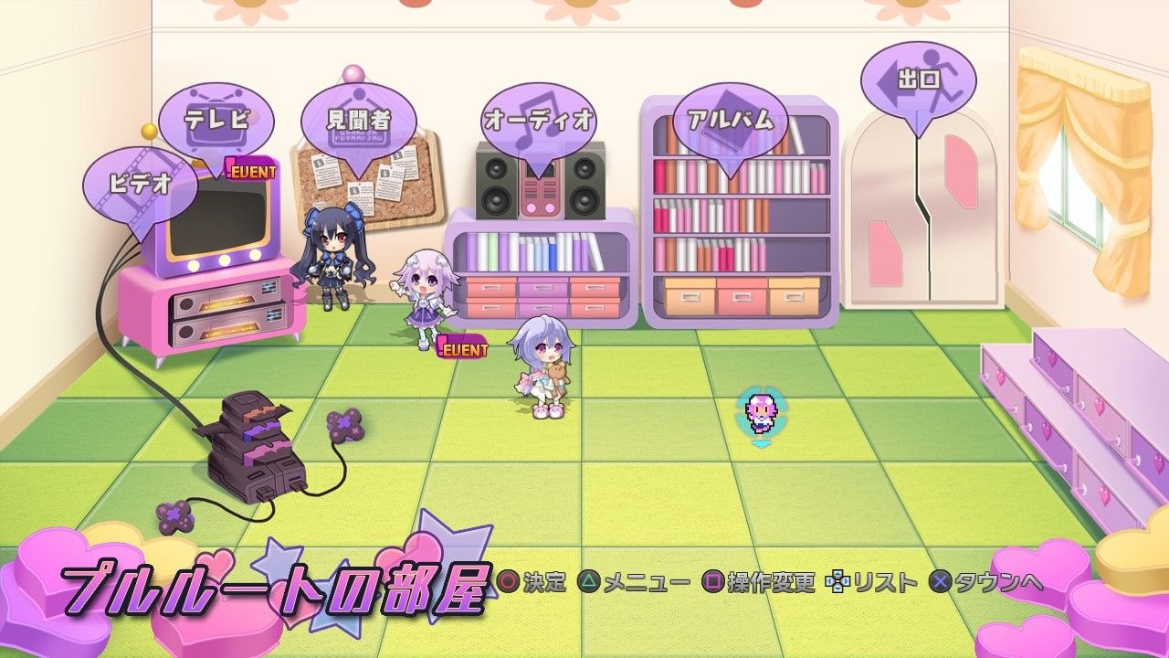 Gotta love the Genesis / 32X combo in Pururut’s room, which doubles as the main menu in Neptunia V. Before you dive into a dungeon, you can choose to either believe an informant who tells you about the dungeon or not. Items inside change depending on your decision, but the result isn’t always good so choose wisely. Neptunia V’s dungeons have flags inside which you can either destroy or bring back to informants to further change what they tell you.