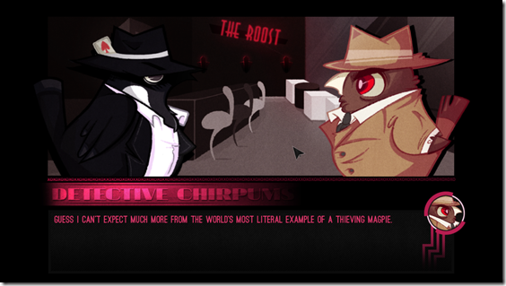 Detective Chirpums: Private Investigator is a visual novel that could, quite easily, best set in the same world as pigeon dating sim Hatoful Boyfriend. It’s a noir-themed mystery game in which you play the titular avian investigator. Set in a city full of thieving magpies and law-upholding wrens, you are the city’s only detective, out to clean up the crooks and cronies. As the noir inspiration demands, Chirpums flutters about in a tan overcoat and rests up by downing a bottle of Grackle’s Finest. Unfortunately, his wreck of a lifestyle means that paying his rent can be tough – he needs to solve a case quick, and get paid. So, off you hop, helping Chirpums to solve puzzles and a crime led by a femme fatale into the heart of The Roost.