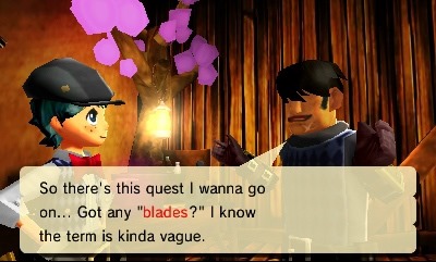 Weapon Shop de Omasse is one part rhythm game, one part Japanese sitcom, one part brutal RPG parody, one part economic store simulator, and two parts Twitter. Keeping up? Good. The game is also one of the smartest commentaries on videogames I’ve come across, leveraging the technology of the present to talk about the past (as well as some commentary on the present slipped in there). It’s an absolutely fascinating sample case for the differences between Japanese and Western humor and how to localize a work so dependent on cultural touchstones and expectations. In short, you’ve never played a game like Weapon Shop de Omasse. Okay, here’s the skinny. You are the boy working the front counter at the weapon shop in the town of Omasse. You are responsible for ordering materials, interacting with customers, polishing weapons, and assisting the master smith in actual forging. Various colorful NPCs will come in and ask you to forge them a weapon for a particular quest or another, and it falls upon you to make something that suits their weapon proficiencies, the weaknesses of the monsters they will face, and their current level.