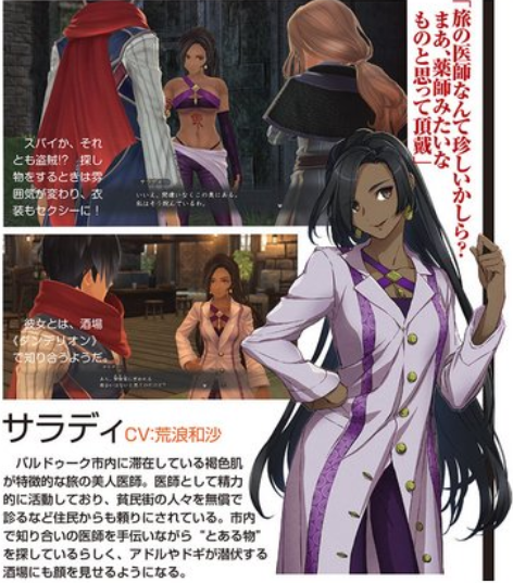 A dark-skinned beautiful traveling doctor currently staying in Barduke. She works actively as a doctor for those in the slums, offering checkups and her services for free. She helps out with a doctor acquaintance, and seems to be searching for a certain somebody, and as such sometimes appears at the bar Adol and Dogi frequents. Silhouette (CV: Natsuko Hara)