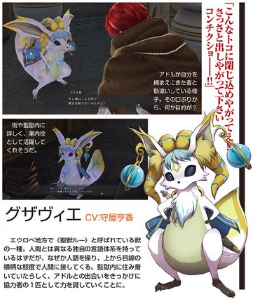 A Roo who can speak human language, and a condescending attitude. It lives in the prison, and becomes Adol’s ally. Tate (CV: Yoshifumi Ono)