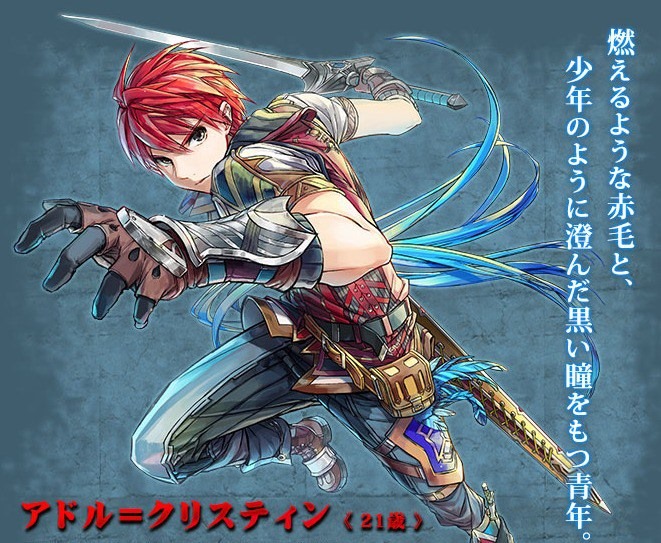 At 16 years of age, he left his his hometown located in a nameless mountain of the regions of Europe , has taken on various adventures including the ancient kingdom “Ys” and the unexplored region “Celceta Sea of Trees.” He was on the passenger ship called “The Lamborida” while traveling across the Goethe Sea, they were assaulted by a mysterious giant sea creature, and Adol, along with the passengers go missing.