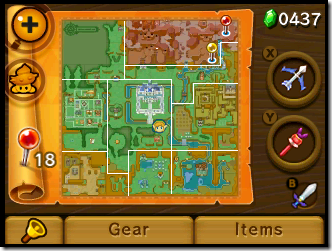 First, it’s important to note that A Link Between Worlds is streamlined for exploration. Unlike Phantom Hourglass and Spirit Tracks, in which the top screen was used for navigation purposes, the bottom screen now serves as a hub for your adventure. It displays an overworld map which you can examine closely using the zoom button. The game gives you 40 pins—20 for each world—which you can drag over areas of interest you may encounter throughout your Journey. You can’t leave notes for yourself or draw on the map as you could in previous handheld Zelda titles, but you can change the color of the pin. Red, blue, and yellow leaves you just enough room to mark mini-games, heart pieces, and Maiamai locations. Don’t worry if you don’t know what a Maiamai is. We’ll cover those in a separate report. The map is an ever-present entity in A Link Between Worlds. Cast aside is the notion of collecting a map in every dungeon. The game throws away tedious necessity in favor of discovery and experimentation. The map is there to help you navigate, but it’s you who has to ultimately make sense of the world. How it is you get from one place to the next isn’t answered with a cursory glance at the bottom screen. It takes some thinking—what some might call “Zelda logic”—to navigate the world effectively. This is especially true for finding your way in and out of both kingdoms, which brings me to my next point.