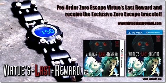 Zero Escape: Virtue’s Last Reward will have an Amazon-exclusive pre-order bonus on both the Nintendo 3DS and PlayStation Vita, Aksys Games have announced. Pre-ordering either version of the game will net you this real version of the bracelet-cum-wristwatch featured in the game: